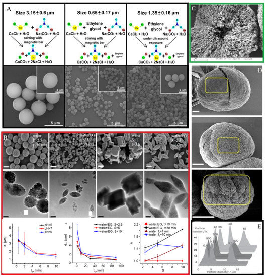 (A) Schematic presentation of the three types of synthesis with varied parameters as stirring time, the presence/absence of ethylene glycol, the salt ratio S, and the pH of the solutions and scanning electron microscopy (SEM) images for the obtained vaterite particles with size diameters of 3.15, 0.65, and 1.35 µm vaterite. Reproduced with permission from [122]. Frontiers Media S.A., 2018; (B) SEM images of the CaCO3 particles synthesized with varying stirring time and presence/absence of ethylene glycol and at pH values of 5, 7, 9 and plots depicted the dependence of particle size from the stirring time. Reproduced with permission from [96]. Springer, 2015; (C) SEM images of cross-section of CaCO3 microparticle. Reproduced with permission [113]. Royal Society of Chemistry, 2004; (D) SEM images of CaCO3 particle grown at different temperature. The pore sizes were found to be 19 ± 5, 28 ± 9, and 44 ± 13 nm for crystals prepared at 7.5, 22, and 45 °C, respectively. Reproduced with permission from [109]. American Chemical Society, 2016; (E) CaCO3 particle size distribution as a function of preparation conditions (salt concentration (c), speed (v) and time (t) of salt stirring). Parameter variations are on the top of the curves. Orange—salt concentration varied (v = 650 rpm, t = 30 s); violet—stirring speed is varied (c = 0.33 M, t = 30 s); green—stirring time is varied (c = 0.33 M, v = 650 rpm). Reproduced with permission from [123]. Wiley Publishing groups, 2012.
