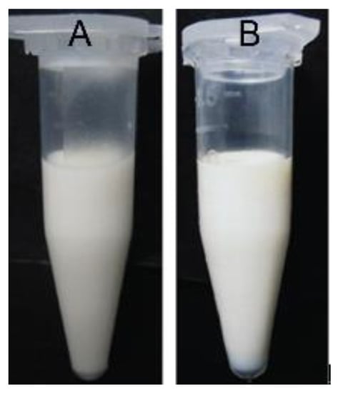 Appearances of puerarin nanocrystals self-stabilized Pickering emulsion (Pu-NSSPE) (A) before and (B) after centrifugation at 4000× g for 15 min.