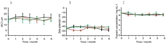 The (A) Droplet sizes, (B) zeta potentials, and (C) puerarin concentrations of Pu-NSSPE during 6 months storage at 4 (