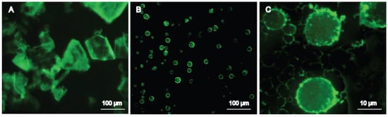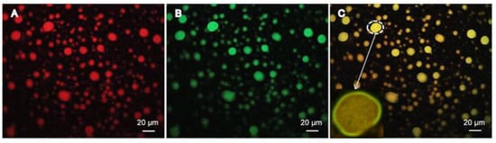 Strong fluorescence was observed by FM for puerarin raw material (Figure 7A). In Figure 7B,C, strong fluorescence was observed on the surface of emulsion droplets, which proves that puerarin nanocrystals were adsorbed on the surface of oil droplets. However, the fluorescence in the interior of emulsion droplets was much weaker, which was due to the small solubility of puerarin in oil phase. Staining the oil phase by Nile red and puerarin nanocrystals by Nile blue, respectively, microstructures of Pu-NSSPE were also studied with CLSM. As shown in Figure 8A, emulsion droplets were all red with Nile red distributed in the oil uniformly. In Figure 8B, strong green fluorescence of Nile blue around emulsion droplets could be observed, which indicated that substances around droplets were different from those inside droplets. Figure 8C was a combined image of A and B. Emulsion droplets showed yellow due to an overlay of green and red color. Green fluorescence was still observed around yellow droplets, which illustrated that the oil droplets were wrapped up in the green Nile blue. This indicated a stable oil (core) and puerarin nanocrystals (shell) structure.