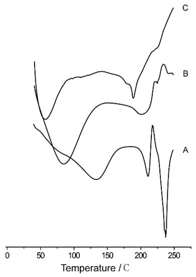 DSC curves of (A) puerarin crude material, (B) lyophilized Pu-NCS, and (C) adsorbed puerarin in Pu-NSSPE.