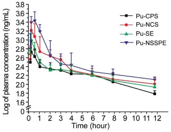 The log diagram of plasma concentration–time curves of Pu-CPS, Pu-NCS, Pu-SE, and Pu-NSSPE after a single administration at the puerarin dose of 200 mg·kg–1 in rats (n = 6, ± SD).