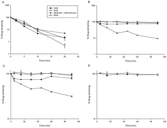 Metabolic stability of midazolam (A), Capilliposide B (LC-B) (B) and Capilliposide C (LC-C) (C) in human liver microsomes (HLM), rat liver microsomes (RLM), mouse liver microsomes (MLM), and MLM with diclorvos, respectively (n = 3). Metabolic stability of LC-A (D) in HLM and RLM (n = 3).