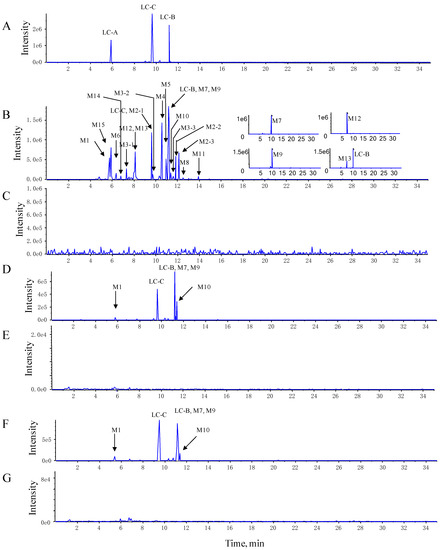 The representative extracted ion chromatograms (XIC) of LC-B, LC-C, and their metabolites. (A) The XIC of standard LC-B, LC-C, and LC-A. (B,C) The XIC of LC-B, LC-C, and their metabolites in pooled feces and blank feces. (D,E) The XIC of LC-B, LC-C, and their metabolites in pooled plasma and blank plasma. (F,G) The XIC of LC-B, LC-C, and their metabolites in pooled urine and blank urine.