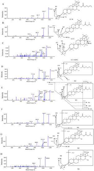 Typical MS/MS spectra of LC-B (A), LC-C (B), LC-A (C), M2-M6 (D–H), respectively.