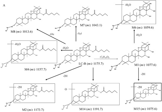 Previously, pharmacokinetics, tissue distribution, and excretion of LC-B and LC-C were systematically evaluated by our group [9,10,11]. Both compounds showed poor bioavailability and low exposure in tissues after oral administration [9]. The recovery of LC-B was less than 10% in rat excreta after intravenous administration, suggesting that LC-B underwent extensive metabolism prior to excretion [11]. Similarly, extensive metabolism of LC-C in rat intestinal microflora was found and the resultant metabolite pool demonstrated a strong anticancer activity [12]. Moreover, the esterolytic metabolite of LC-C, Capilliposide A (LC-A), also exhibited a significant cytotoxicity against HepG2 cells [12]. However, the metabolic process of LC-B and LC-C remains unclear. Thus, a systemic study is required to investigate the metabolism of LC-B and LC-C.