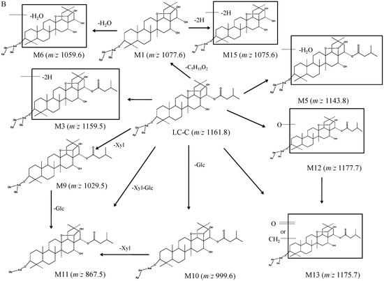 The M13 and LC-B demonstrated the same [M-H]− ion at m/z 1175.7, but it was 14 Da larger than that of the protonated LC-C. M13 was only found in feces and its retention time was found to be 8.13 min (Figure 2B). According to the mass difference from the parent compound, M13 was produced after either introduction of one oxygen atom with dehydrogenation or methylation. The main fragmental ions at m/z 1043.7 (-Xyl), 881.7 (-Xyl-Glc), and 719.6 (-Xyl-2Glc) via the neutral loss of sugar moieties (Figure S1). M14 was only found in feces and its retention time was 7.36 min (Figure 2B). The [M14-H]− ion was 16 mass units larger than that of LC-B, suggesting that hydroxylation occurred in the skeletal structure of LC-B. It fragmented into m/z 1059.8, 897.6, and 735.5, which indicated xylose, Xyl-Glc, and Xyl-2Glc were lost from its deprotonated molecular ion (Figure S1).