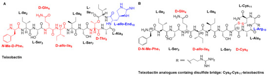 (A) Teixobactin, (B) Cys8–Cys11 disulfide-teixobactins.