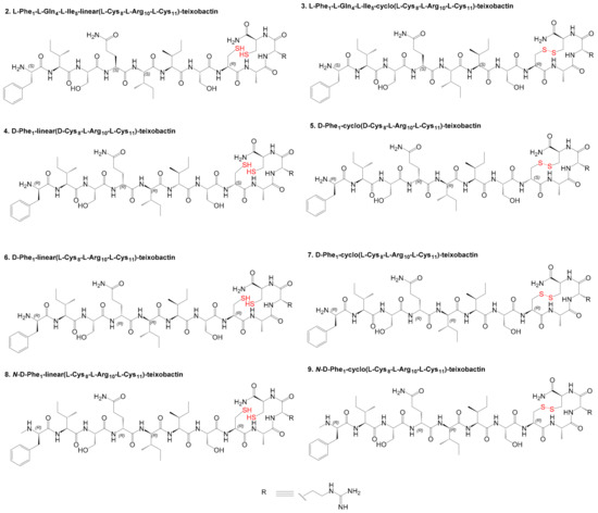 The following are available online at http://www.mdpi.com/1999-4923/10/4/183/s1, Table S1: Compound number, name, chemical formula, exact mass and mass found for compounds 2–9. Figure S1: HPLC trace of purified teixobactin analogue 2 (gradient: 5–95% ACN in 25 min using. A: 0.1% HCOOH in water, B: ACN). Figure S2: ESI-MS of purified teixobactin analogue 2. Exact mass calcd. For C53H90N16O14S2 = 1238.63, found M + H+ = 1239.62, M/2 + H+ = 620.38. Figure S3: HPLC trace of purified teixobactin analogue 3 (gradient: 5–95% ACN in 25 min using A: 0.1% HCOOH in water, B: ACN). Figure S4: ESI-MS of purified teixobactin analogue 3. Exact mass calcd. For C53H88N16O14S2 = 1236.61, found M + H+ = 1237.72, M/2 + H+ = 619.47. Figure S5: HPLC trace of purified teixobactin analogue 4 (gradient: 5–95% ACN in 25 min using A: 0.1% HCOOH in water, B: ACN). Figure S6: ESI-MS of purified Teixobactin analogue 4. Exact mass calcd. For C53H90N16O14S2 = 1238.63, found M + H+ = 1239.57, M/2 + H+ = 620.76. Figure S7: HPLC trace of purified teixobactin analogue 5 (gradient: 5–95% ACN in 25 min using A: 0.1% HCOOH in water, B: ACN). Figure S8: ESI-MS of purified teixobactin analogue 5. Exact mass calcd. For C53H88N16O14S2 = 1236.61, found M + H+ = 1237.53, M/2 + H+ = 619.53. Figure S9: HPLC trace of purified teixobactin analogue 6 (gradient: 5–95% ACN in 25 min using A: 0.1% HCOOH in water, B: ACN). Figure S10: ESI-MS of purified teixobactin analogue 6. Exact mass calcd. For C53H90N16O14S2 = 1238.63, found M + H+ = 1239.57, M/2 + H+ = 620.76. Figure S11: HPLC trace of purified teixobactin analogue 7 (gradient: 5–95% ACN in 25 min using A: 0.1% HCOOH in water, B: ACN). Figure S12: ESI-MS of purified teixobactin analogue 7. Exact mass calcd. For C53H88N16O14S2 = 1236.61, found M + H+ = 1237.56, M/2 + H+ = 619.36. Figure S13: HPLC trace of purified teixobactin analogue 8 (gradient: 5–95% ACN in 25 min using A: 0.1% HCOOH in water, B: ACN). Figure S14: ESI-MS of purified teixobactin analogue 8. Exact mass calcd. For C54H92N16O14S2 = 1252.64, found M + H+ = 1253.64, M/2 + H+ = 627.44. Figure S15: HPLC trace of purified teixobactin analogue 9 (gradient: 5–95% ACN in 25 min using A: 0.1% HCOOH in water, B: ACN). Figure S16. ESI-MS of purified teixobactin analogue 9. Exact mass calcd. For C54H90N16O14S2 = 1250.63, found M + H+ = 1251.63, M/2 + H+ = 626.24.