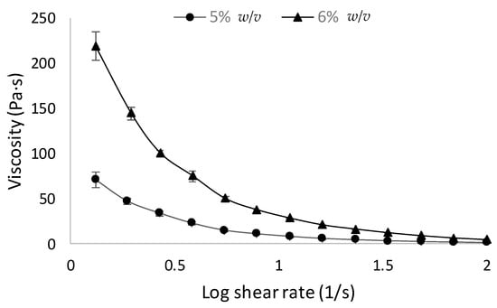 The rheological profiles of the AP hydrogels are shown in Figure 2. Viscosity was dependent on the concentration of AP, with the 6% w/v hydrogel being more viscous than the 5% w/v counterpart (Figure 2). Viscosity decreased with an increase in shear rate for both AP concentrations. Data therefore demonstrated that the AP hydrogel displays a shear-thinning behavior.