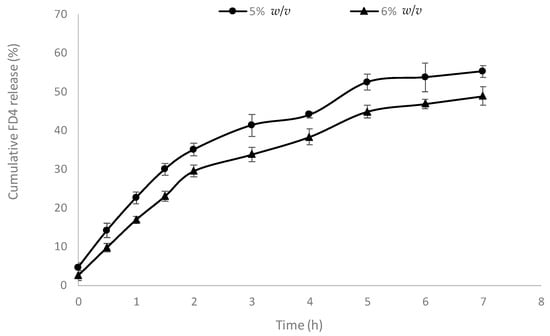 Studies evaluating the release profile of FD4 (used as a model macromolecular drug) from the AP hydrogel were conducted in HBSS as a physiological buffer. The hydrogel was placed on a filter (Transwell inserts) to support the hydrogel, and the released FD4 (capable of passing through the filter pores) was sampled from the acceptor compartment. Figure 3 shows a sustained release of FD4 from the hydrogels. FD4 release from the 5% w/v AP hydrogel reached 52.42% within five h of the study, followed by a plateau for the subsequent measurement period. FD4 release peaked at approximately 55%. FD4 release from the 6% w/v AP hydrogel peaked at approximately 49% in seven h. Considering the higher drug release from the 5% hydrogel, this system was selected for subsequent cell culture experiments.