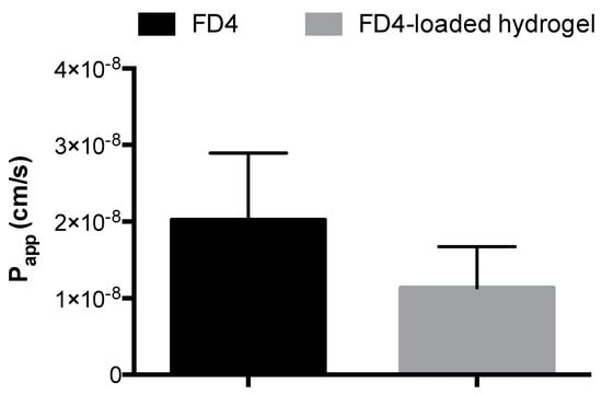 The permeability of FD4 loaded on 5% w/v AP hydrogel across Caco-2 cell monolayers was tested to assess the potential of the hydrogel for intestinal delivery of macromolecules. FD4-loaded hydrogel was compared with free FD4 (applied at equivalent concentration); the difference in permeability between these conditions was not statistically significant (Figure 5).