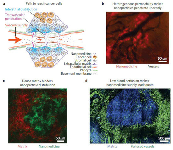 The barriers of functional nanoparticles for penetrated delivery into the tumor. (a) The path to the cancer cells. (b) Heterogeneity of the tumor decreases the penetration of drug/nanoparticles unevenly. (c) The dense extracellular matrix hinders nanoparticle distribution. (d) Low blood perfusion causes the nanomedicine supply to be insufficient. Reprinted from Reference [3] with permission from Springer Nature, 2013.