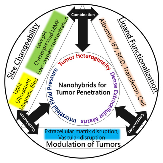 Several studies reported the ability to overcome these barriers in tumor treatments. Specifically, the treatments can be divided into three strategies involving size, functionalization, and modulation. Firstly, the size effect is a passive but extremely important and useful factor to control the penetrating ability of nanomedicines. Through the size-responsiveness to inner stimuli such as pH, oxygen concentration, and overexpressed proteins in the tumor microenvironment, or to outer stimuli such as light, ultrasound, and magnetic fields, the conformations of the nanoparticles can be varied to enhance their distribution at the tumor site. Secondly, functionalization is an active, efficient, and continuous process of penetrating ligands or structures for transcytosis and transvascular deliveries. Thirdly, the modulation of tumors is also an effective process to vary the tumor microenvironment and decrease the barriers of tumor heterogeneity. The dense ECM of the tumor impedes the drugs/nanoparticles from entering deep into the tumor, leading to insufficient therapeutic efficacy. Therefore, modulating tumors to loosen their ECM can improve the distribution of drugs and nanoparticles at the tumor (Figure 2). To evaluate the penetration of nanoparticles, researchers developed different kinds of models, including three-dimensional (3D) multitumoral spheroids (MTS) and an extracellular matrix model, to prove the tumor penetration [7]. This review integrates the physicochemical properties of different nanomaterials and the pharmacological strategies for enhancing their penetration, and a great step forward is expected in overcoming the limitations of nanomedicines in tumor therapies and clinical trials.
