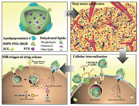 A well-known peptide, arginine-glycine-aspartic acid (RGD), can bind to αvβ3/αvβ5 integrins, which are overexpressed on the endothelial cells of tumor angiogenic vessels and cancer cells in the deep tumor. Binding to the receptor of endothelial cells may increase the targeting capability of nanoparticles to tumor vessels, thereby enhancing the penetration capability of drug delivery systems. Hence, Miura et al. displayed the excellent targeting of U87MG tumors by applying a platinum prodrug encapsulating cyclic RGD (cRGD)-conjugated polymeric micelles. These cRGD-conjugated polymeric micelles exhibited good accumulation at the tumor site and excellent permeability from the blood vessel to the deep tumor, compared to the nontargeted particles. The selective accumulation of cRGD-linked micelles in the tumors occurred after active transcytosis, leading to significant drug penetration and antitumor effects in U87MG human glioblastoma cells [31]. In addition, Gao et al. also enhanced the targeting property of polymeric particles by conjugating RGD and interleukin-13 peptide (IRNP), achieving the targeting of both neovasculature and cancer cells at the same time; RGD was applied for binding αvβ3 on the neovasculature, and interleukin-13 peptide targeted interleukin-13 receptor alpha 2 (IL13Rα2) on the cancer cells. A cell study showed that both targeting ligands enhanced the cellular uptake of C6 and human umbilical vein endothelial cells, suggesting that αvβ3 regulated the internalization of RGD-conjugated particles, and that IL13Rα2 mediated the internalization of interleukin-13 peptide-conjugated particles. The ligand modification led to different endocytosis pathways through modifying the original endocytosis pathways from macropinocytosis to clathrin-mediated endocytosis. On the other hand, the tumor penetration capability of the targeting particles was based on an in vitro tumor spheroid study. It was shown by tissue staining that the targeted particles delivered therapeutic agents and promoted tumor penetration in vivo with higher and more homogeneous intensity than modified nanoparticles [32]. The combination of penetrating ligands was also reported by Wang et al. who formulated bioinspired nanoparticles with native high-density lipoproteins (HDLs) conjugated to iRGD to enhance tumor penetration. The anticancer drug, paclitaxel (PTX), and the fluorescent tracer, indocyanine green (ICG), were loaded into the HDLs for the combination therapy. The iRGD-conjugated HDLs were combined with natural lipoproteins and artificial functions to improve cellular uptake, tumor accumulation, and deep tumor penetration compared to particles that were not modified. Furthermore, the drug-loaded HDLs exhibited a rapid drug release in the cell and achieved chemo-phototherapy that totally suppressed the tumor in vivo [33] (Figure 4). Overall, RGD successfully achieves tumor targeting and tumor penetration, increasing therapeutic efficacy.