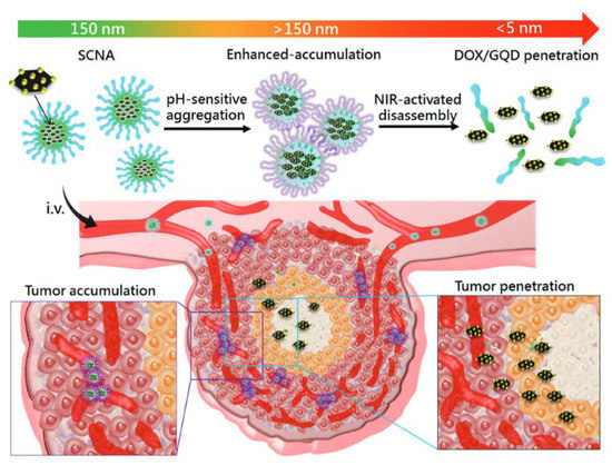 Our group also generated a size-changeable graphene quantum dot (GQD) nanoaircraft (SCNA) that possesses hierarchical tumor-targeting efficacy and transports a high dose of therapeutic agents into deep tumors. The particle was fabricated by ultrasmall GQDs and a pH-responsive polymer that aggregates in the weakly acidic microenvironment of the tumor and is able to stabilize at neutral pH and function as a ligand. The size transition in the tumor microenvironment is triggered by an external near-infrared irradiation with a wavelength of 808 nm, which releases GQDs loaded with anticancer drugs to the deep tumor and facilitates drug transportation in the tumor via the ultrasmall materials. Furthermore, the GQD and drugs can affect the neighboring cancer cells for wide-range cancer cell killing. The hierarchically targeted particle can be achieved by pH-sensitive and light-triggered penetrated delivery of drugs by size changeability into the deep tumors [53] (Figure 5).