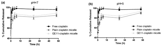 Percent cumulative release profile of cisplatin from plain and GE11 cisplatin micelles at different pHs in (a) PBS (pH = 7.4) and (b) acetate buffer saline (pH = 5.0). (*) denotes where the cumulative release of free drug appeared to be significantly different from plain and GE11 cisplatin micelles at the related time points (p < 0.05, Student’s t test). Data are represented as mean ± SD (n = 3).