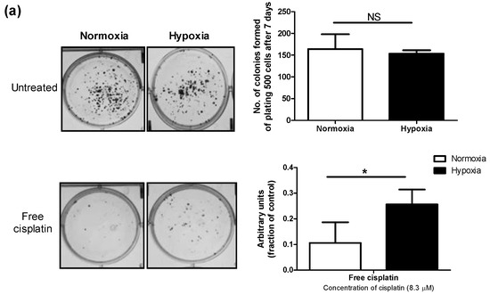 The MDA-MB-231 cells incubated under hypoxic conditions were shown to be less sensitive to cytotoxic effects of cisplatin as measured by MTT assay. Cells cultured under hypoxia had a significantly higher number of colonies surviving cisplatin treatment than cells grown under normoxic conditions, as well (Figure 2a). Moreover, apoptosis induced by cisplatin was significantly reduced under hypoxia, as evidenced by a significant decrease in the proportion of late apoptotic cells measured by FITC Annexin V/propidium iodide (PI) assay (Figure 2b). The viable proportion of cells also showed a significant increase under hypoxic conditions compared to normoxic ones, when treated with cisplatin (Figure 2b). Interestingly, the proportion of necrotic cells following treatment with cisplatin under hypoxic conditions increased compared to normoxia, pointing to a change in the predominant mode of cisplatin-induced cell death under hypoxic conditions. This phenomenon was also previously reported for prostate carcinoma [40]. Similar to observation on free cisplatin (Figure 3a), we found less sensitivity towards polymeric micellar cisplatin in MDA-MB-231 cells cultured under hypoxic conditions by MTT assay (Figure 3b,c). There was also no significant difference between cell responses to micellar versus free cisplatin irrespective of the oxygen content for cell culture (one-way ANOVA with Tukey post-test, p > 0.05).