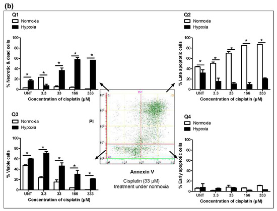 Hypoxia confers chemoresistance to free cisplatin in MDA-MB-231 cells. (a) Colony formation ability was assessed for cells treated with cisplatin (8.3 µM) after 24 h incubation under normoxic or hypoxic conditions. Cells were then re-plated at a density of 500 cells/well in duplicate in six-well plates under normoxia. The number of colonies formed from 500 cells after 7 days was graphed. (b) Cisplatin induced-apoptosis under normoxic and hypoxic conditions was measured by flow cytometric analysis of Fluorescein IsoThioCyanate (FITC) Annexin V staining in a buffer containing propidium iodide. MDA-MB 231 cells were left untreated or treated with increasing concentrations of cisplatin for 48 h. Flow cytometry analysis showed different populations of (Q1) necrotic or already dead cells (PI positive), (Q2) cells in end-stage apoptosis (FITC Annexin V and PI positive), (Q3) viable cells (FITC Annexin V and PI negative), and (Q4) cells in early stage of apoptosis (FITC Annexin V positive and PI negative). 2D plot is representative of cells treated with cisplatin (33 µM) under normoxia for 48 h. Data are represented as mean ± SD (n = 3). (*) denotes a significant difference between hypoxic and normoxic groups at each individual concentration (Student’s t test, p < 0.05).