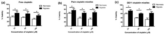 Hypoxia confers chemoresistance to free and micellar formulations of cisplatin in MDA-MB-231 cells. Viability of MDA-MB-231 cells was measured by MTT assay for cells treated with increasing concentrations of (a) free cisplatin; (b) plain cisplatin micelles and (c) GE11 cisplatin micelles under hypoxic or normoxic conditions for 48 h. (*) denotes a significant difference between groups at each individual concentration (Student’s t test, p < 0.05).
