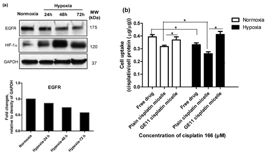Modification of cisplatin micelles with GE11 peptide enhances the cellular uptake of cisplatin in MDA-MB-231 cells. (a) High levels of epidermal growth factor receptor (EGFR) expression under normoxia and hypoxia in MDA-MB-231 cells; (b) The GE11-peptide decoration of cisplatin micelles enhanced cellular uptake of cisplatin under hypoxia in MDA-MB-231 cells and bridged the gap of its cellular uptake under hypoxia and normoxia. Cisplatin content was measured by ion coupled plasma mass spectrometer (ICP-MS) after 24 h treatment of cells with cisplatin (166 µM) under hypoxia or normoxia. (*) denotes a significant difference between compared groups (Student’s t test, p < 0.05).
