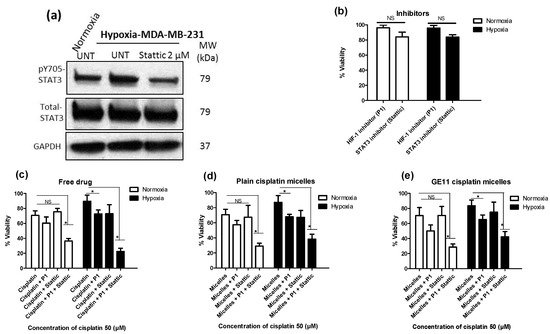 Dual pharmacological inhibition of signal transducer and activator of transcription 3 (STAT3) and hypoxia inducing factor-1 (HIF-1) in combination with free cisplatin or its micellar formulations successfully reversed hypoxia-induced chemoresistance. (a) Lower expression of pSTAT3 in MDA-MB-231 cells after treatment with STAT3 inhibitor (Stattic). Phosphorylation of STAT3 Tyr705 was analyzed by Western blot. (b–d) Viability of MDA-MB-231 cells was measured by MTT assay for cells which first pre-incubated with the HIF-1 inhibitor (named P1) (50 µM), the STAT3 inhibitor (Stattic) (2 µM) or both under normoxia for 4 h and then incubated under hypoxia for additional 48 h (b) in the absence of cisplatin or in the presence of 50 μM (c) free drug; (d) plain cisplatin micelles and (e) GE11 cisplatin micelles. (*) denotes a significant difference between compared groups (one-way ANOVA with Tukey post-test, p < 0.05).