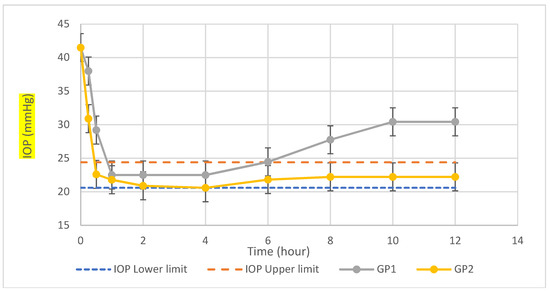 Mean IOP of hypertensive rabbits for first 12 h with different administration in comparison with physiological minimum IOP for rabbit (IOP lower limit) and physiological maximum (IOP upper limit).