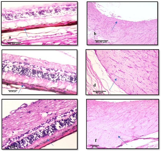 Histopathology microscopy of (a) Retinal atrophy with loss of retinal ganglion cells of sham group. (b) Optic nerve of sham group showing Wallerian degeneration and marked excavation. (c) Mild retinal atrophy with some loss of ganglion cells and small vacuoles after treatment with carvedilol solution (GP1). (d) Optic nerve showing Wallerian degeneration and without excavation after treatment with carvedilol solution (GP1). (e) Improvement of retinal atrophy with some loss ganglion cells and no vacuolation of choroid after treatment with carvedilol leciplex (GP2). (f) Optic nerve showing mild edema and thickening without excavation after treatment with carvedilol leciplex (GP2).