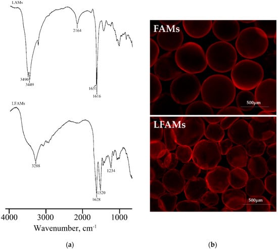 Fourier transform infrared (FT-IR) spectra of lyophilized alginate microcarriers (LAMs) and lyophilized fibroin-coated alginate microcarriers (LFAMs) in the spectral region 4000–1000 cm−1 (a). Representative micrographs of fibroin-coated microcarriers (FAMs) and LFAMs after exposition at green light. Magnification 4X (b).