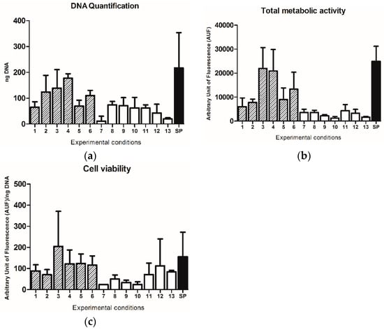 (a) DNA quantification, (b) total metabolic activity and (c) cell viability of samples for each protocol (1: 20 RPM, 30 min, intermittent, 1000 µL; 2: 20 RPM, 120 min, intermittent, 1000 µL; 3: 10 RPM, 60 min, intermittent, 400 µL; 4: 10 RPM, 120 min, intermittent, 400 µL; 5: 5 RPM, 30 min, intermittent, 400 µL; 6: 5 RPM, 90 min, intermittent, 1000 µL; 7: 20 RPM, 60 min, continuous, 400 µL; 8: 20 RPM, 90 min, continuous, 400 µL; 9: 10 RPM, 30 min, continuous, 1000 µL; 10: 10 RPM, 60 min, continuous, 1000 µL; 11: 10 RPM, 120 min, continuous, 400 µL; 12: 5 RPM, 30 min, continuous, 400 µL; 13: 5 RPM, 120 min, continuous, 1000 µL; SP: 70 RPM, 120 min, continuous, 1000 µL). Results are reported as mean ± SD.