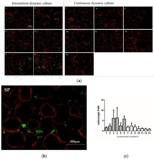 Similarly, cell viability resulted in being slightly affected, showing a higher level in samples cultured with the intermittent dynamic protocols, even if no statistically significant differences were observed (Figure 4c).