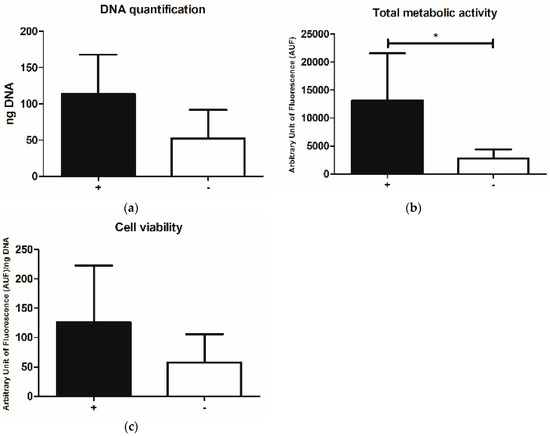 (a) DNA quantification, (b) total metabolic activity and (c) cell viability of samples grouped for the intermittent (+) vs. continuous (−) dynamic culture. Results are reported as mean ± SD. * p < 0.05.