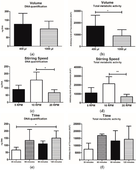 (a,c,e) represent the DNA content while (b,d,f) represent the total metabolic activity of samples cultured with intermittent dynamic protocols (1–6), grouped for volume LFAMs/cells suspension (µL) (a,b), stirring speed (RPM) (c,d) and time of the process (min) (e,f). Data are expressed as mean values ± SD. * p < 0.05, ** p < 0.01.