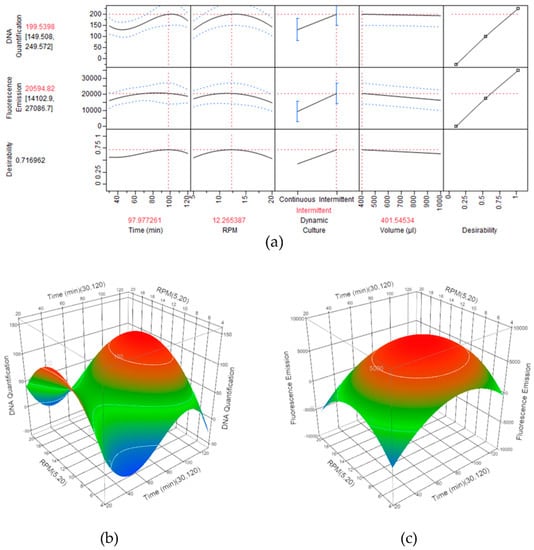 DoE outcome reporting the optimal parameter configuration obtained maximizing the desirability in the statistical software. (a) Extraction of the optimal combination by the maximization of the input variables. (b) Surface profiles of the DNA quantification and (c) of the total metabolic activity, related to the seeding time (min) and the stirring speed (RPM). (red: maximum efficiency; green: medium efficiency; blue: low efficiency).