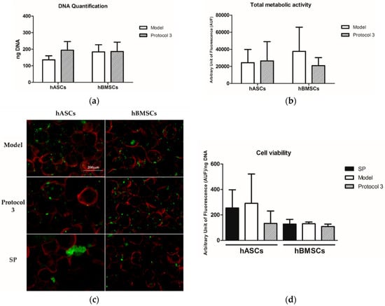 When the model protocol was applied, the DNA amount of adhered cells on LFAMs was 136 ± 24 ng and 183 ± 44 ng for hASCs and hBMSCs, respectively (Figure 7a).