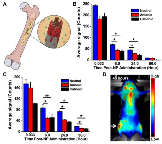 Passive targeting of nanoparticles to bone marrow. (A) Scheme showing passive targeting of NPs (green spheres) into bone. NPs pass through the fenestrations in sinusoidal capillaries to localize in bone marrow. NP (B) charge on blood residence time and (C) bone accumulation. Neutral charge NPs showed greater accumulation in tibia than similarly sized anionic and cationic NPs. (D) Neutral charge NPs showed greater localization in tibia with bone metastasis (white arrow) than healthy tibia. Reprinted with permission from Reference [93].