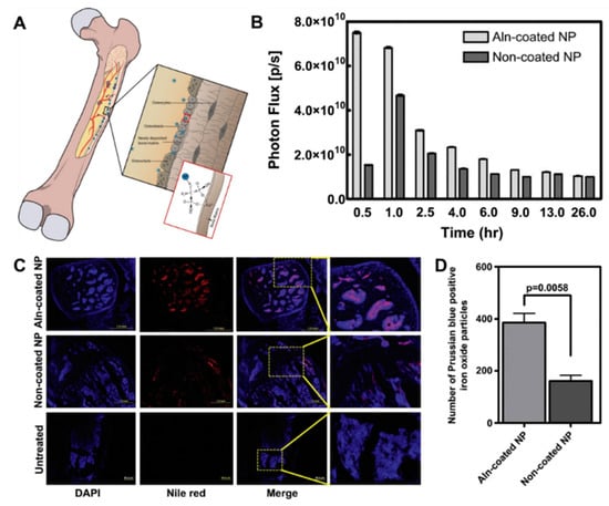 Active targeting of nanoparticles to bone using bisphosphonates. (A) Scheme showing targeting of bisphosphonate-functionalized NPs to bone. (B) Quantification of alendronate (Aln)-conjugated NPs accumulation into bone over time. (C) Representative image of Nile red-labelled NP localization in mouse femurs. (D) Quantification of number of NPs in the bone marrow. Reprinted with permission from Reference [96].