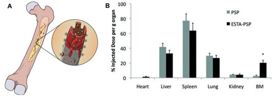 Drug delivery to the bone-marrow vasculature. (A) Scheme showing NP interaction with endothelial cells of bone-marrow capillaries. (B) Accumulation of E-selectin-targeted NPs (ESTA-PSP) to bone. Reprinted with permission from Reference [102].