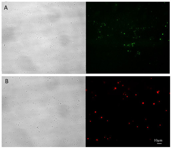 Figure 3A, the unlabeled NHs show the intrinsic fluorescence of the riboflavin molecule (green fluorescence), whereas the marked NHs show the typical intense red fluorescence of rhodamine (