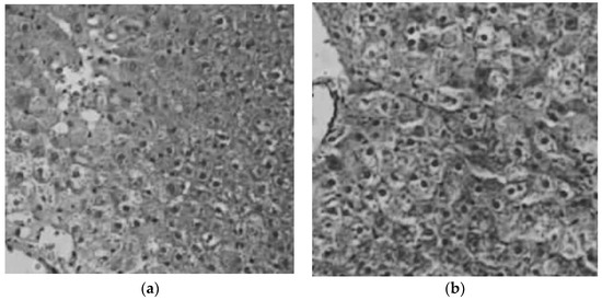 At the predefined times, the animals were sacrificed by CO2 inhalation and immediately after the thoracic cavity and the upper abdominal cavity were opened to exsanguinate. First, a blood sample was taken from the heart. Then, a needle connected to a saline serum bag was inserted into the left ventricle and the right atrial appendage was cut, allowing drainage of all organs and exsanguination. At the end of this process, the following organs were excised: spleen, brain, heart, liver, lungs and kidneys. The blood was centrifuged at 8000 rpm for 10 min and the supernatant (plasma) was taken. The organs were weighed and homogenized. A sample of the hepatic tissue was collected before homogenization and was placed into formol 20% to preserve it. Hepatic biopsies of these tissues were carried out to by ACV LAB—Laboratorio de Analítica Clínica Veterinaria S.L. to analyze the potential changes due to NHs accumulation.