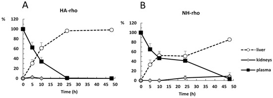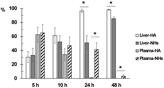 Figure 6 shows the evolution of disappearance in blood and the accumulation in liver of both formulations. The difference between the percentage of distribution of NHs and polymer in liver and plasma is statistically significant at 24 and 48 h after administration. The retention time of the NHs in plasma is significantly higher than that of HA.