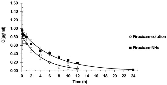 Pharmacokinetic plasma profiles were determined after intravenous administration of a piroxicam solution or piroxicam encapsulated in NHs. Plasma drug concentration versus time are reported in