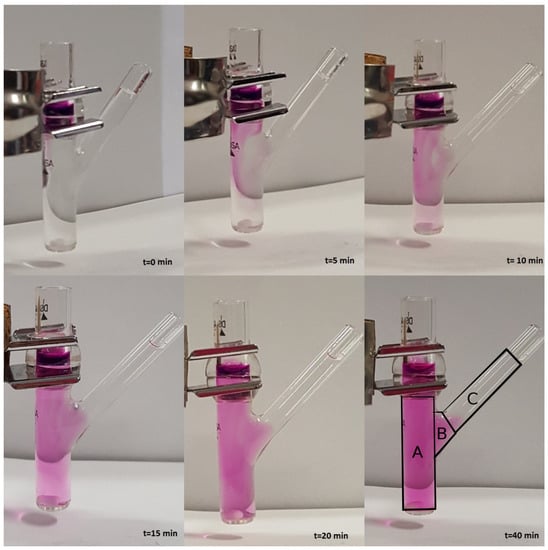 From Figure 2 and Figure 3, it can be clearly observed that the lateral arm is almost unaffected by mixing induced by the magnetic stirrer. In fact, the dye concentration in the lateral arm is negligible or at least significantly lower than that in the main stirred body of the receptor chamber for both rotational speeds. Moreover, it can be clearly identified a “color/concentration transition zone” at the connection between the main cylindrical body (well mixed, especially at 500 rpm) and the later arm (totally unmixed).