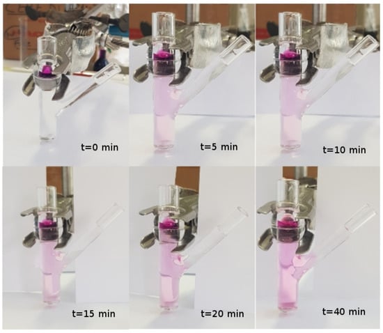 Release experiment in an unjacketed Franz cell at C with a colored marker (KMnO 0.1 M in distilled water). Rotational speed: 500 rpm. The reason why the color is much fader in this experiment as compared to that with 100 rpm—the concentration of KMnO being the same—is only a matter of colors in the photo (different camera and different light exposition).