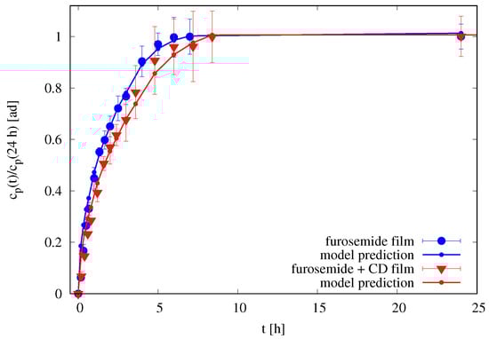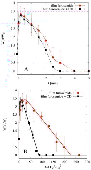 Figure 6B shows the comparison between experimental data and model predictions (continuous lines) in terms of the dimensionless time , i.e., the physical time rescaled onto the diffusion time that takes into account film thickness (significantly larger for films with HP--CD). This representation better highlights that the erosion effect is larger for films with HP--CD, as confirmed from best fit values for the erosion constant C for film with and without HP--CD.