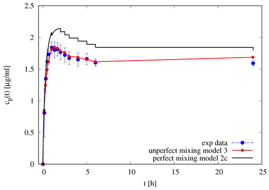 Figure 8B shows the integral release curves (dashed curves with point) as usually evaluated in the literature, i.e., from experimental data and Equation (21), by assuming a perfectly mixed accepting compartment mL. It can be observed that the integral release curve significantly underestimates the total amount of drug asymptotically released, i.e., , while the imperfect mixing model (continuous lines) predicts . The two integral curves and cannot coincide because they are based on different basic assumptions.
