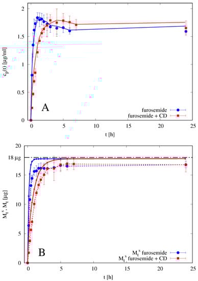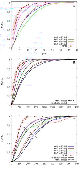 Figure 10A shows integral release curves vs. t (min) as obtained with the USP II apparatus and with the MFTD with flow rates mL/min. No error bars for MFTD data (repeated in triplicate) are reported because of the large amount of data (output drug concentration is recorded every 2 s from the UV/Vis analyzer), but the maximum standard deviation is an order of 10%, i.e., , where represents the output concentration at time instant , averaged over three repeated experiments.