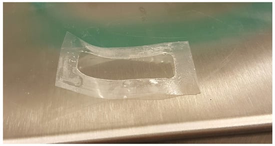 We expect that erosion, quantified by the disentanglement rate, is maximum in the USP II apparatus and that increases with the flow rate Q in the MFTD, because the larger the flow rate is, the larger the shear stress at the gel-solvent interface is (see Figure 11 for a detail of erosion effect on a film after complete release in the MFTD). This is confirmed by the analysis of the disentanglement rate estimated from a best fit of experimental release data and reported in Table 3. Erosion is also responsible for the “wavy” behavior of the MFTD release curves due to the possible detachment of small pieces of film that can affect UV/Vis detection of drug concentration.