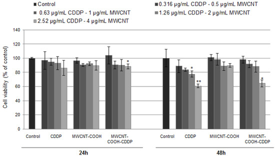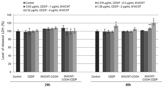 - Balas, M.; Constanda, S.; Duma (Voiculet), A.; Prodana, M.; Hermenean, A.; Pop, S.; Demetrescu, I.; Dinischiotu, A. Fabrication and toxicity characterization of a hybrid material based on oxidized and aminated MWCNT loaded with carboplatin. Toxicol. In Vitro 2016, 37, 189–200. [Google Scholar] [CrossRef] [PubMed]