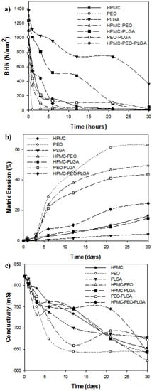 Physical properties of compressed polymeric discs following exposure to simulated CSF over a period of 30 days: (a) Changes in the Brinell Hardness Number (N/mm2; N = 3; SD < 23.67 N/mm2); (b) Matrix erosion (%; N = 3; SD < 0.05%); and (c) Changes in conductivity (µSiemens; N = 3; SD < 16.34 µS).